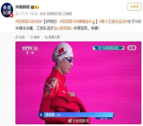据央视新闻微博消息,第十五届全运会女子100米蝶泳决赛,江苏队选手张雨霏夺得冠军。