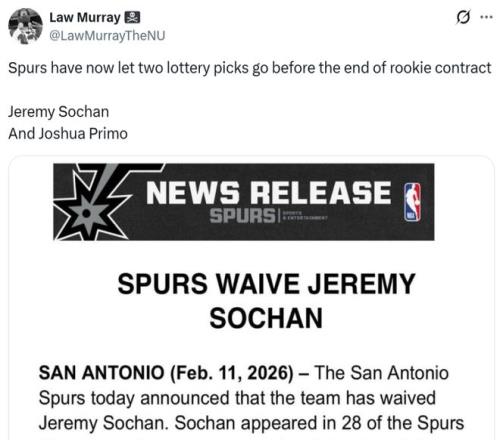 赛前马刺官方宣布裁掉22年9号秀杰里米-索汉,这是马刺连续第二年裁掉乐透秀,上个赛季马刺曾裁掉21年12号秀普里莫,两人都没能执行完新秀合同。