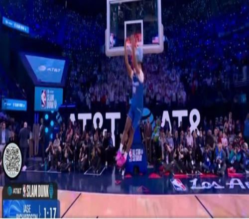 卡特-布莱恩特从右侧弧顶开始启动,抛球到篮下第一次落点不理想,随后再次尝试冲到篮下,腾空完成接反弹球大风车暴扣得到49.4分,两轮比赛合计得到94.8分。