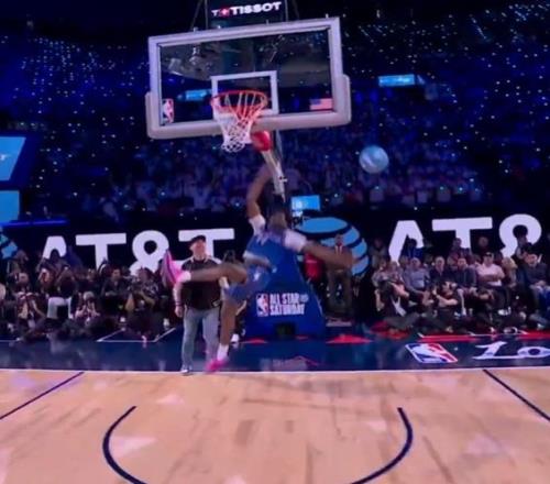 卡特-布莱恩特决赛第一扣从右侧弧顶启动,抛球到篮下加速起飞高高跃起,接反弹球完成胯下换手侧身暴扣,由于难度更高获得满分50分,也是今年扣篮大赛首个满分扣篮。